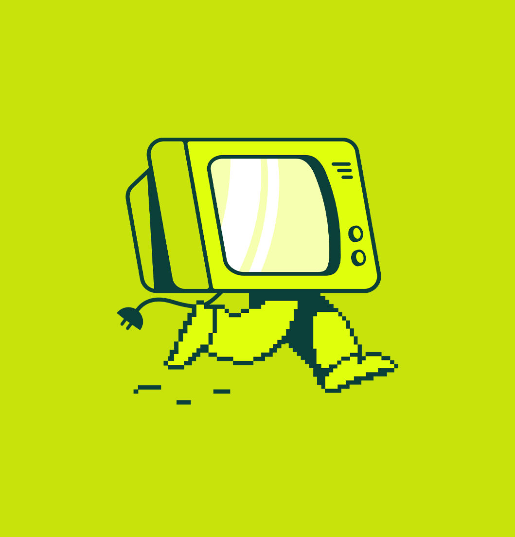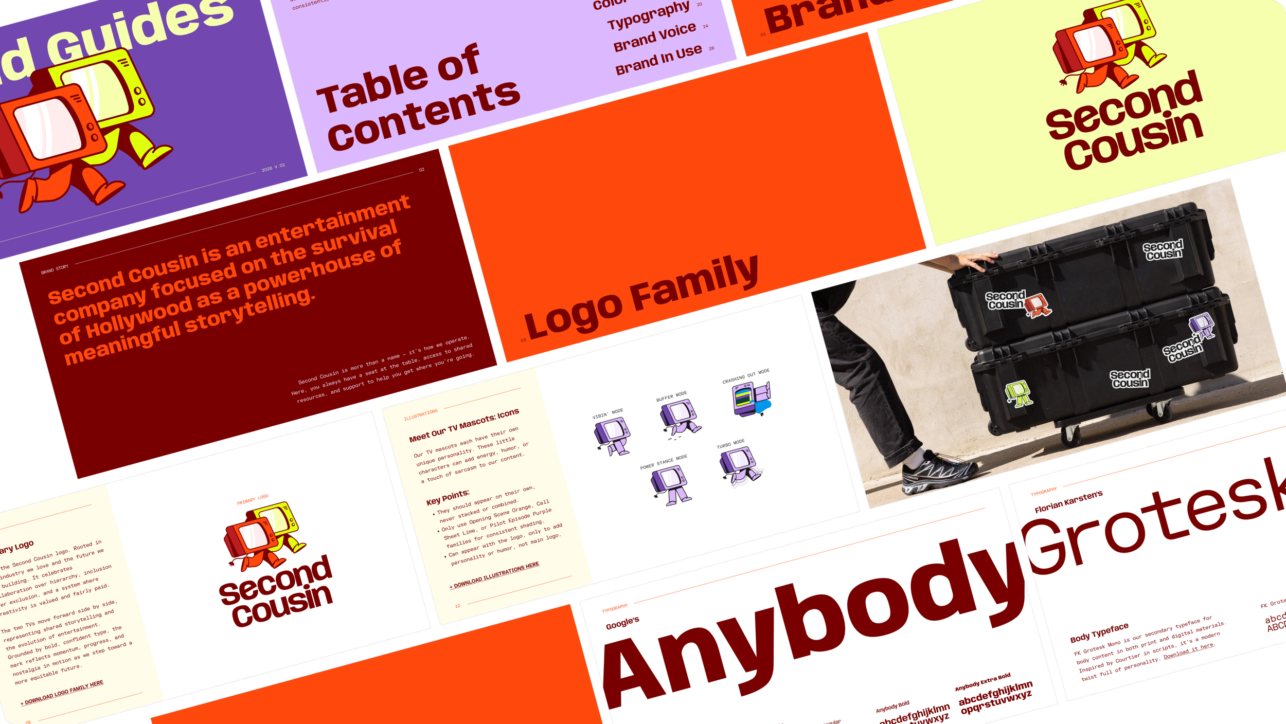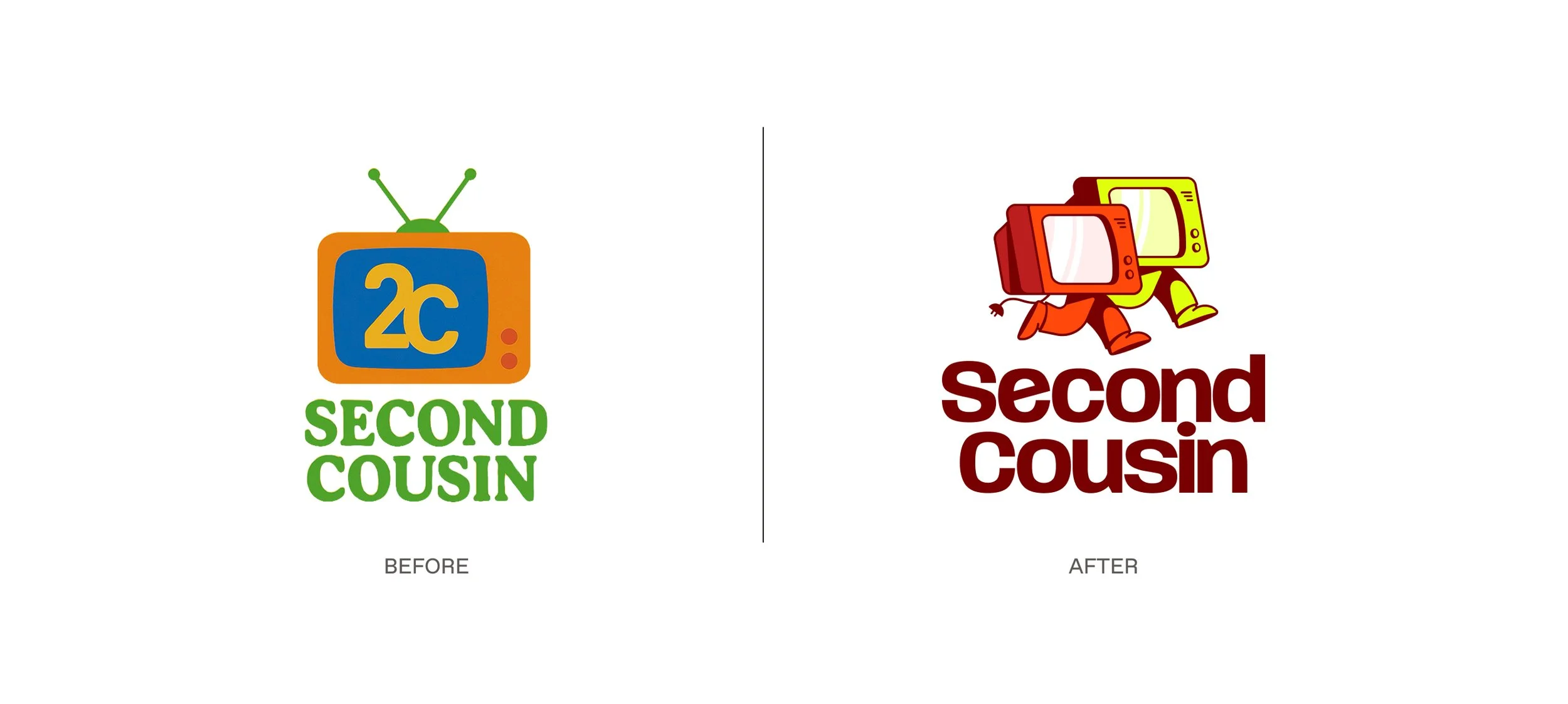 The logo features two retro TV characters moving forward side by side, representing shared storytelling and the evolution of entertainment. The playful TV mascots each have their own personality, adding energy and humor to the brand. Grounded by bold, confident typography, the mark reflects Second Cousin's mission: building a system where creativity is valued and fairly paid.